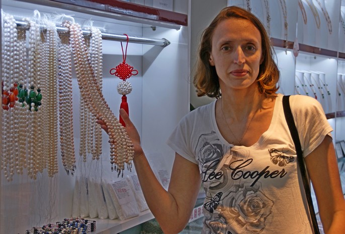 Китайский жемчуг - одна нить стоит 20 юаней, примерно 3€.