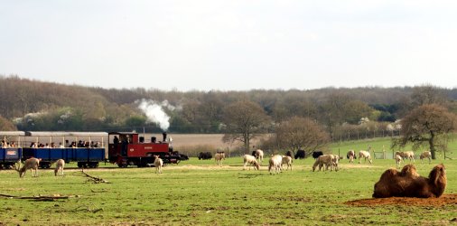 По парку можно покататься на паровозе, который постоянно гудит, разгоняя верблюдов, оленей и других животных гуляющих прямо по рельсам.