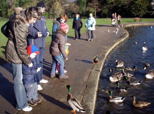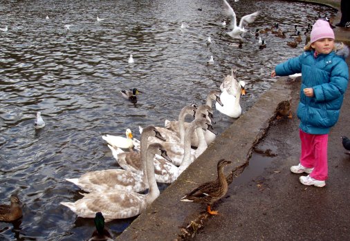 :: Настырные гуси-лебеди разгоняют птиц поменьше в борьбе за лакомый кусочек хлеба.