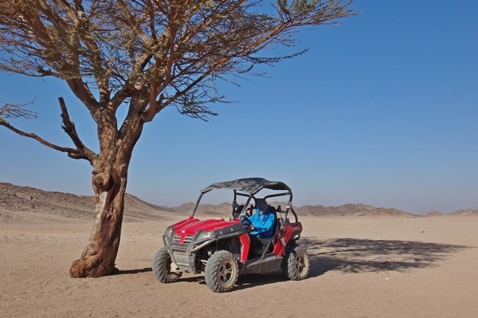 то сейчас поехали на современной двухместной багги CFMOTO - такие есть и у нас, но у нас нет пустыни... В Египте же на таких кататься одно наслаждение - она не боится даже приличных булыжников (мы несколько раз налетали на такие днищем)