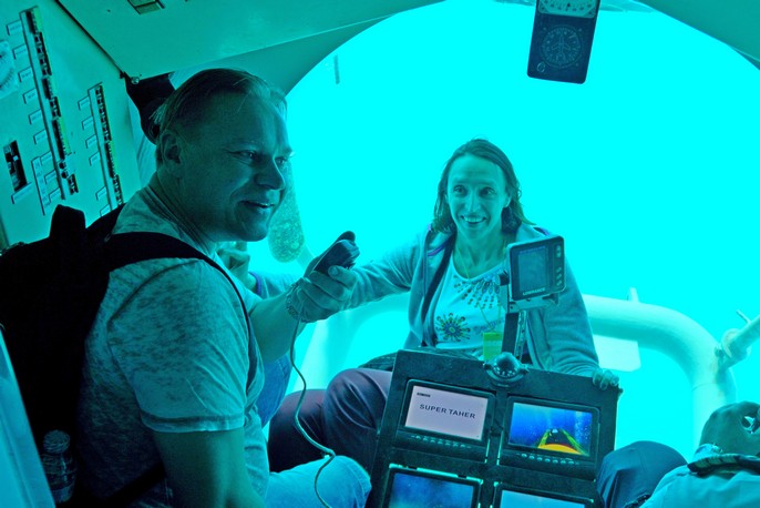 Видимо ради безопасности эта лодка и не плавает там, где глубина больше 25 метров, поскольку мы в буквальном смысле ложились на дно.