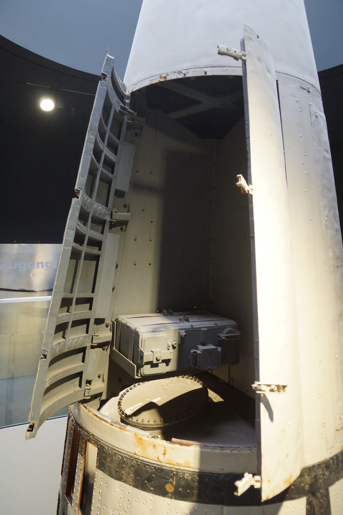 А ведь сделали и летала же. Три этажа в высоту, стоит в Мюнхенском музее. Снизу металлическая стартовая площадка, видимо входившая в комплект, отводящая пламя из сопла в разные стороны - возможно для стабилизации.