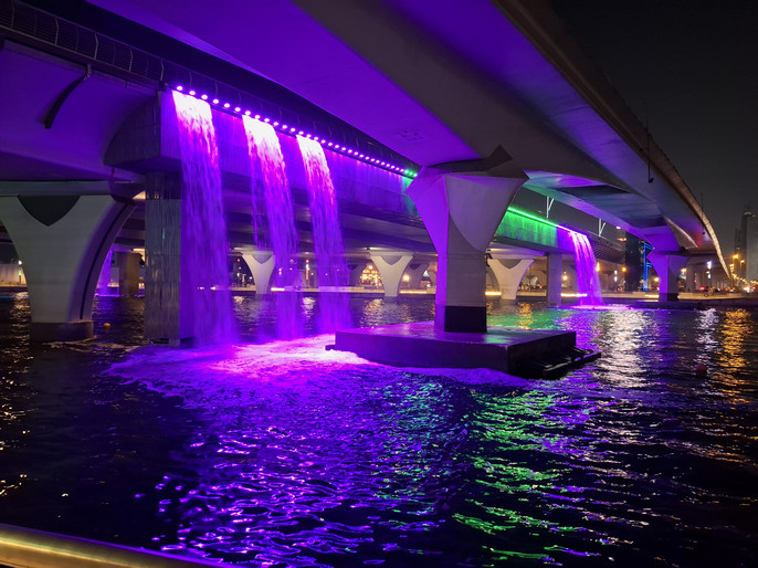 водопад раскрывается как шторы в театре, подсветка с красноватой меняется на зелёную и можно свободно проплывать по фарватеру, а через какое то время шторы снова закрываются. Как и раньше, Дубай не перестаёт удивлять.