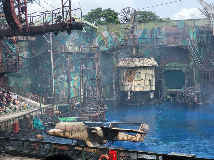 Мы попали на представление "Водный мир". Это интересный фильм сам по себе, а тут всё происходит у тебя на глазах, гидроциклы, катера, каскадёры на большой скорости носятся по сцене и обливают первые ряды водой...