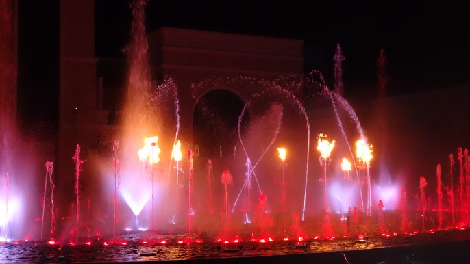 Затем все перемещаются к началу канала, где идёт представление поющих фонтанов. Так же круто как в Дубае, только не так масштабно. Зато вместе с водой танцует и огонь! Сделано невероятно, даже не знаю что это за технология.