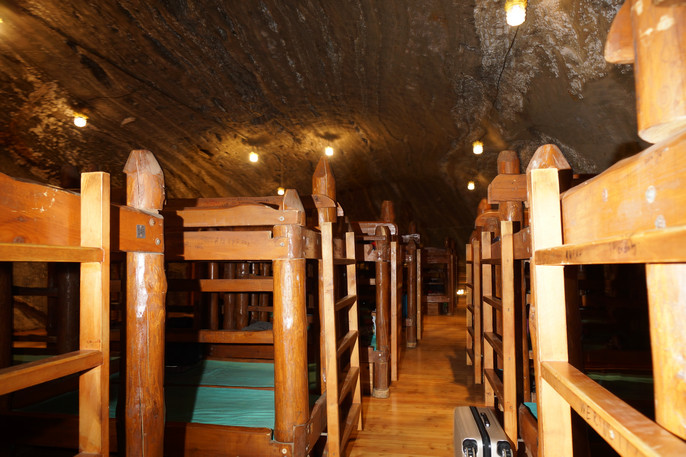 Но оказалось ничего подобного, спали как младенцы. Ничуть не холодно под одеялом, хоть температура в пещере всего 14 градусов, а благодаря толстым конструкциям двухэтажных деревянных кроватей, сделанных реально из брёвен, соседей толком и не слышно.